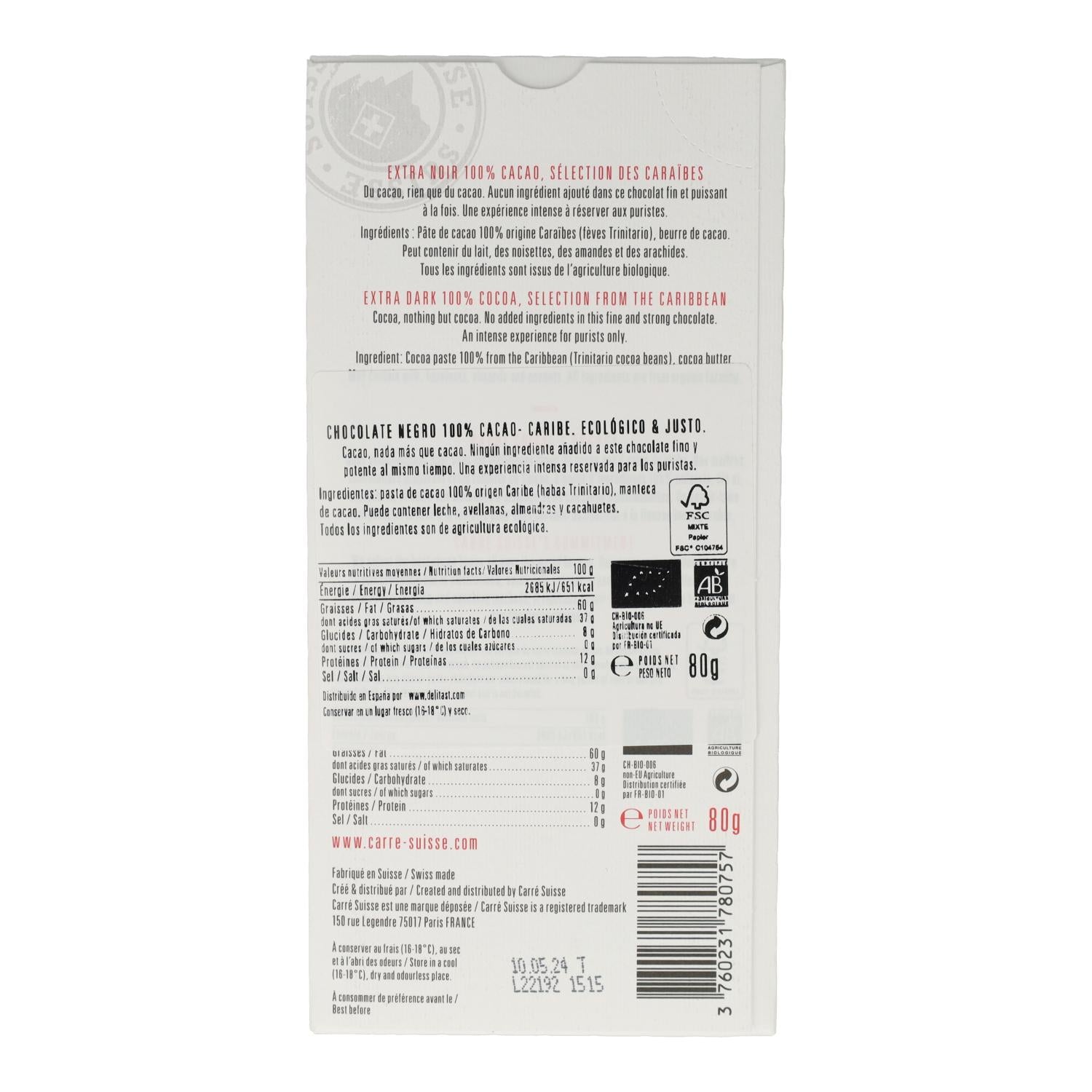 Tableta Chocolate Negro 100% Caribe Chocolates Carré Suisse 80 g