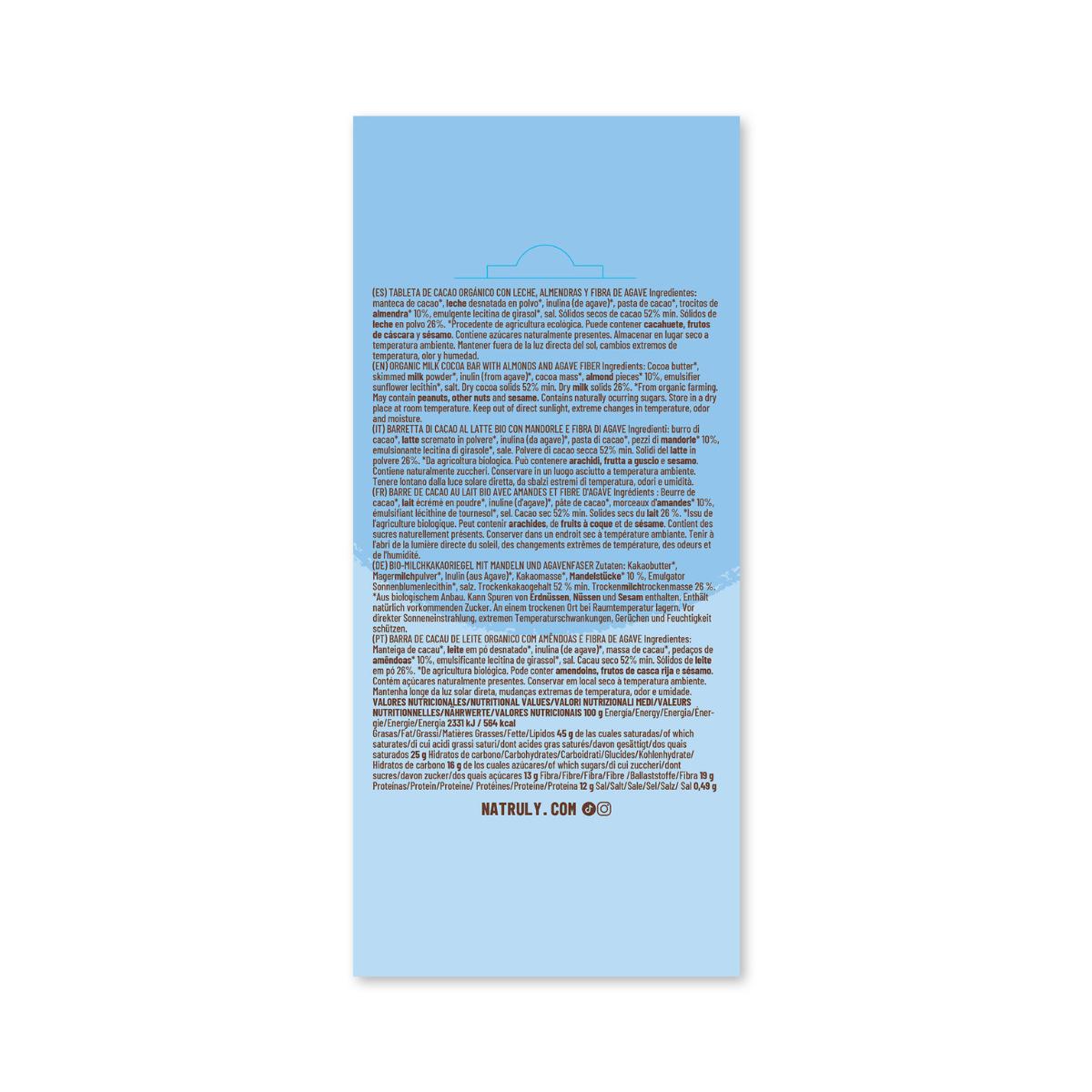 Trozos de almendra (10%), manteca de cacao, leche desnatada en polvo, insulina (de ágave), emulgente: lecitina de girasol.