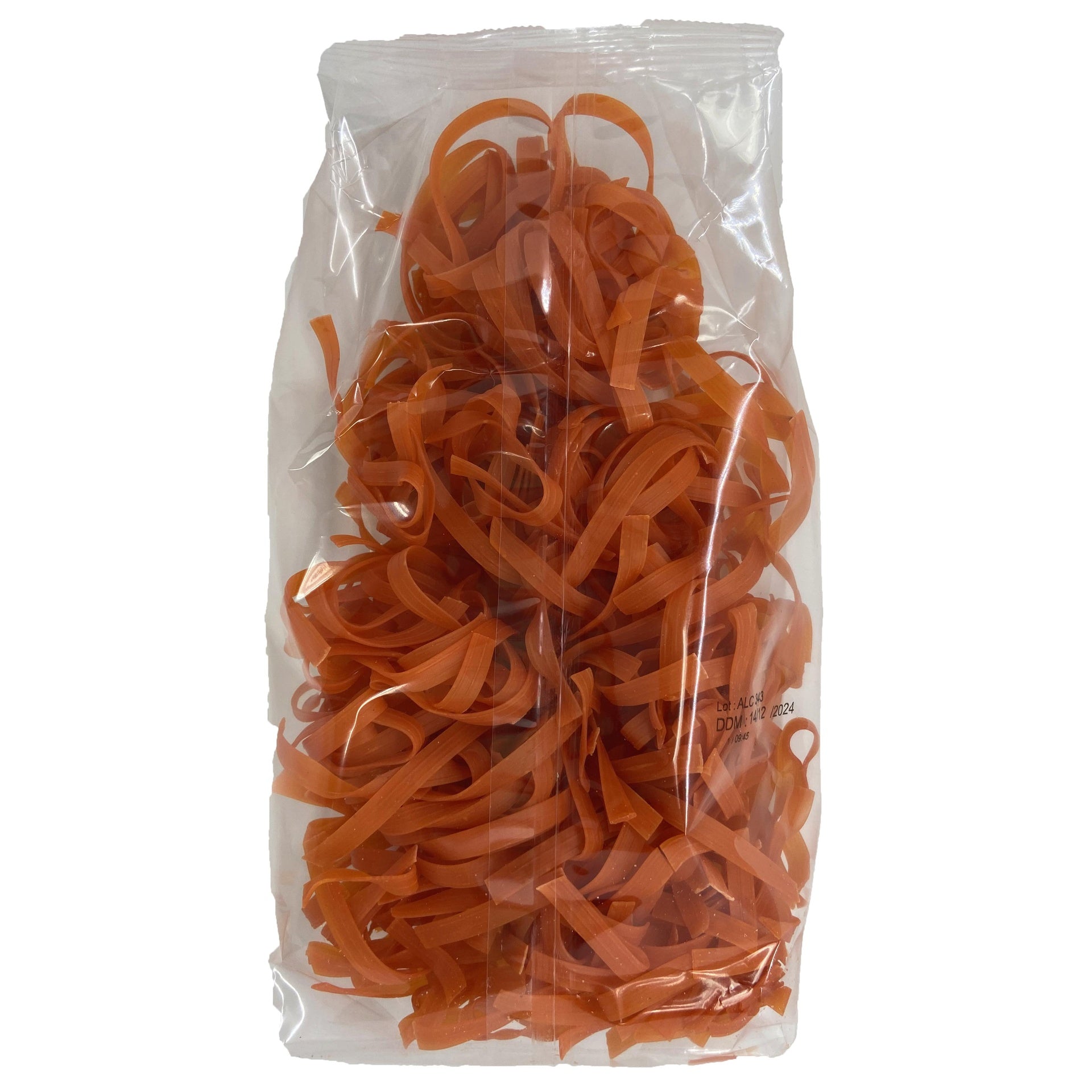 Tallarines elaborados con harina de lenteja roja procedente de agricultura ecológica. Pasta sin gluten que aporta una alta cantidad de proteínas y fibra, ideal para dietas saludables y sin gluten.