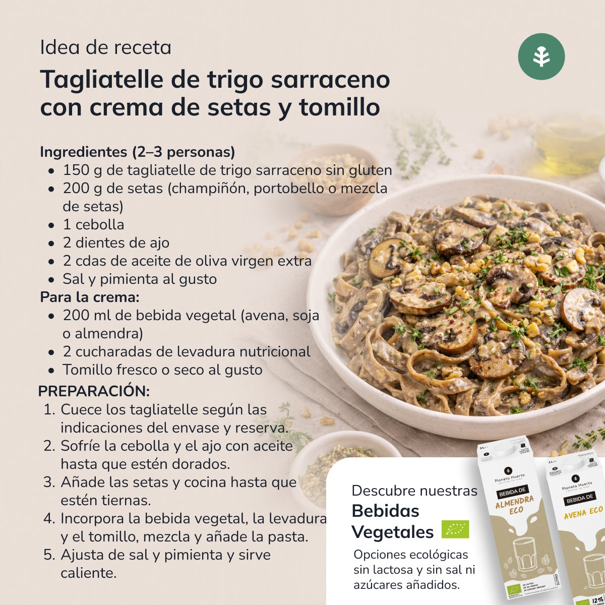 Pasta ecológica elaborada exclusivamente con trigo sarraceno procedente de agricultura ecológica. Su formato tagliatelle es ideal para acompañar salsas intensas y platos completos. Producto sin gluten, apto para personas celíacas o dietas sin gluten.