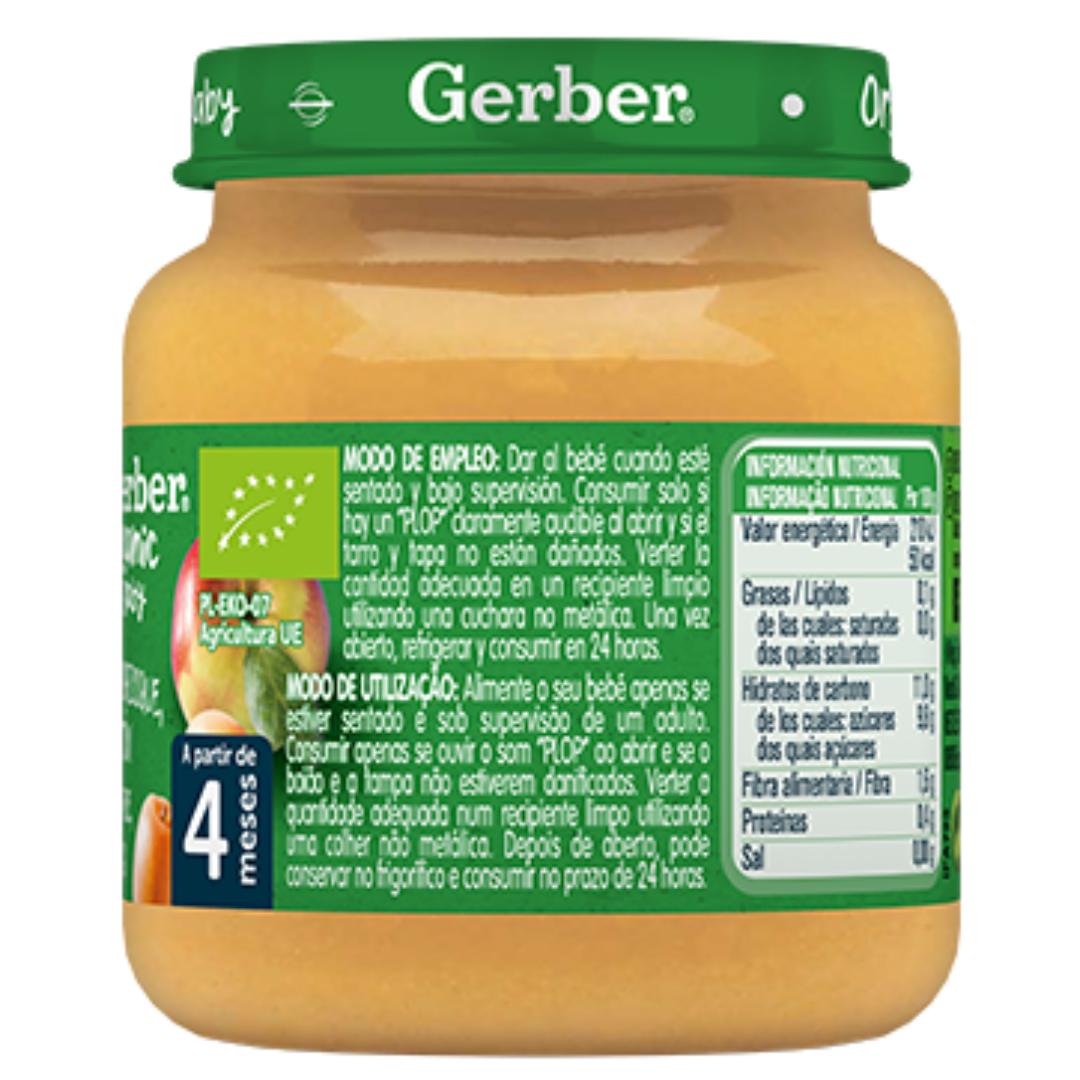 Toda la información sobre "Tarrito de puré de frutas ecológico para bebés de Manzana, Albaricoque y Melocotón Gerber 125 g"