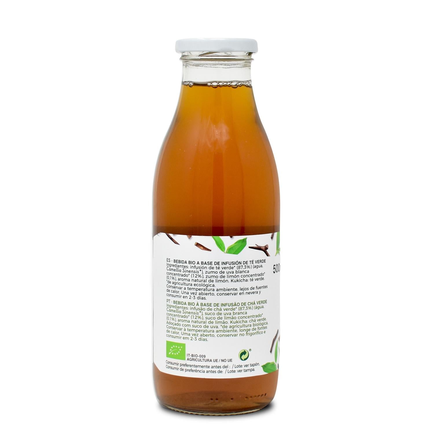 Té Kukicha en botella, dulcificado con zumo de uva y certificado como Gluten Free.