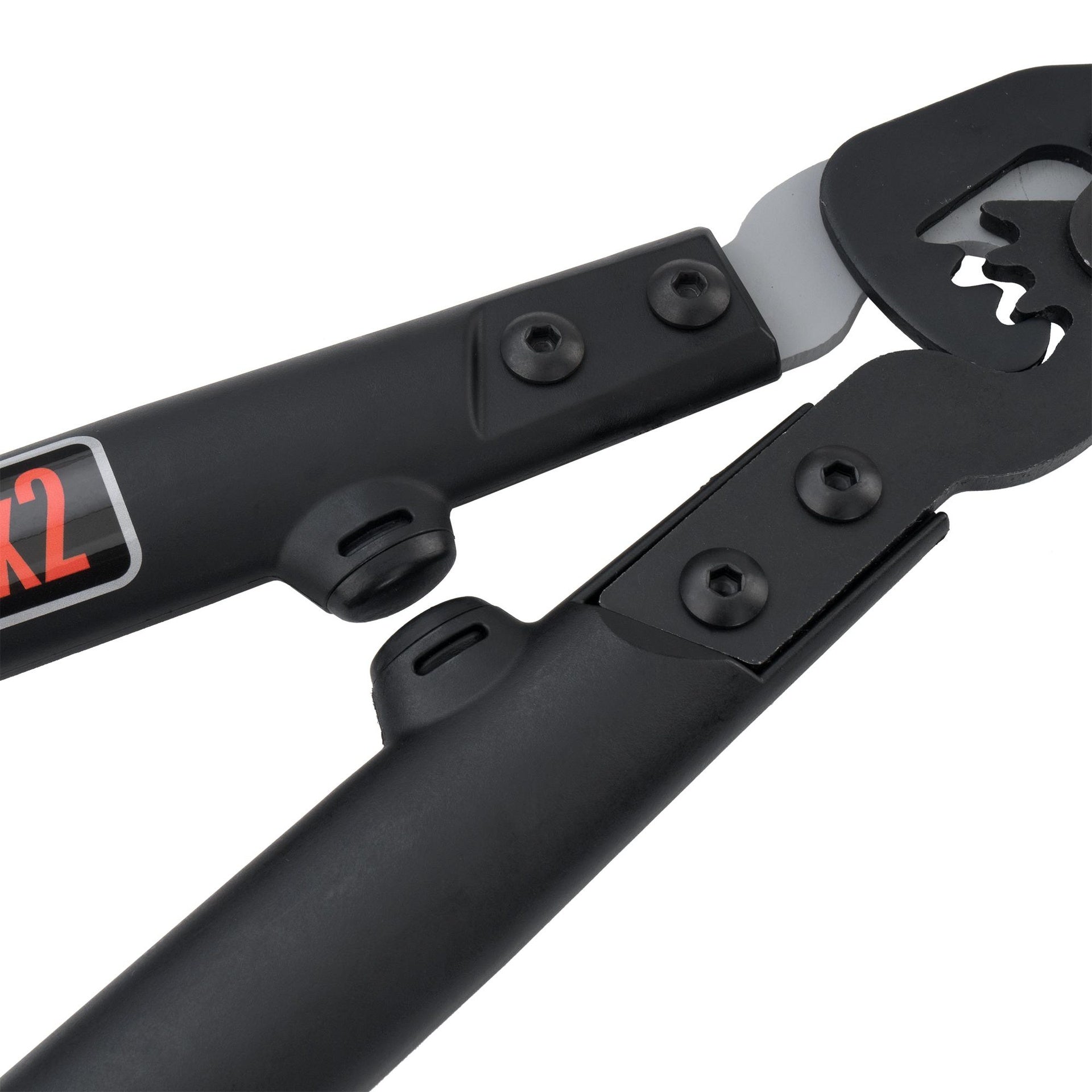 Tijera de dos manos con multiplicador de fuerza mediante diente de engrane.