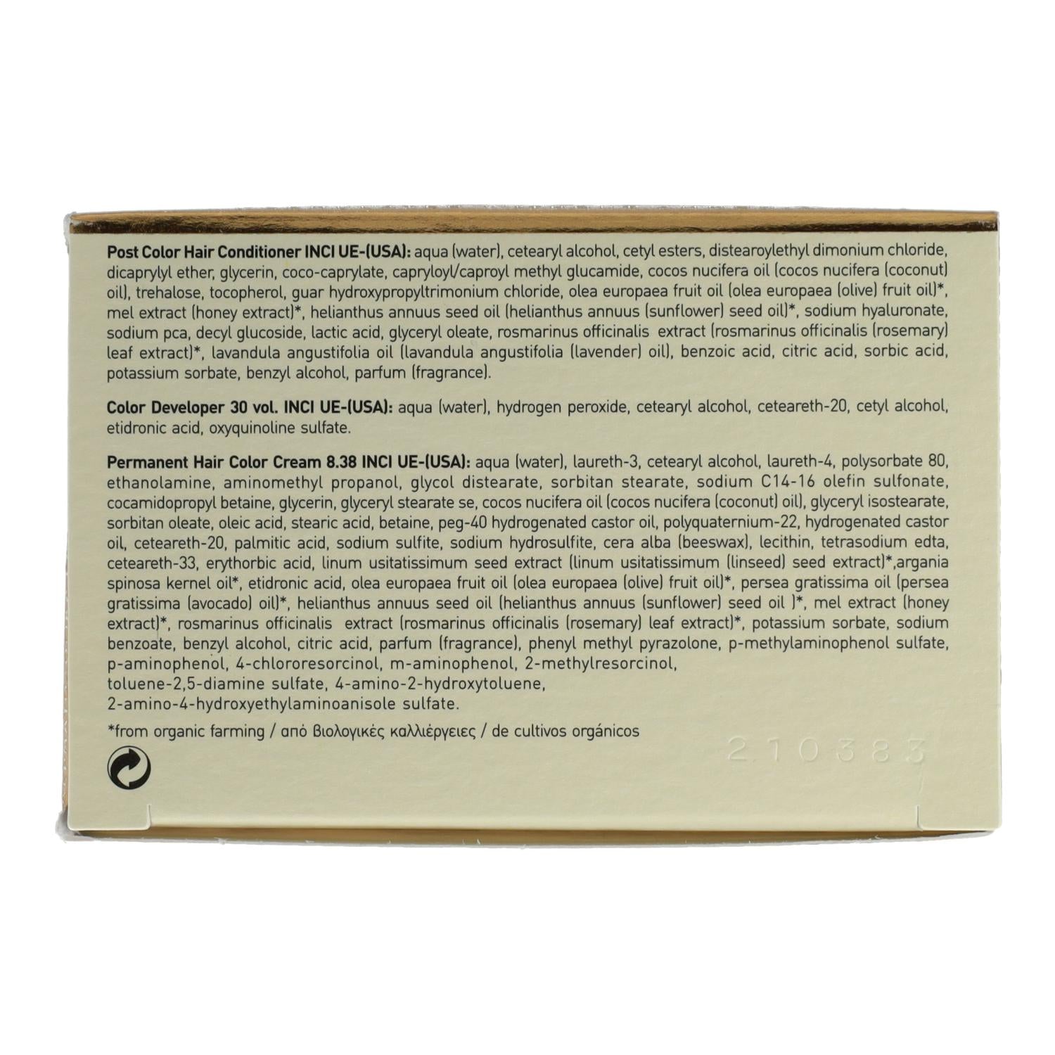 Coloración Permanente en Crema para el Cabello 8.38 INCI UE-(EE.UU.): aqua (agua), laureth-3, alcohol cetearílico, laureth-4, polisorbato 80, etanolamina, aminometil propanol, diestearato de glicol, estearato de sorbitán, olefina sulfonato de sodio C14-16, cocamidopropil betaína, glicerina, estearato de glicerilo, aceite de cocos nucifera. (aceite de cocos nucifera (coco), isoestearato de glicerilo, oleato de sorbitán, ácido oleico, ácido esteárico, betaína, aceite de ricino hidrogenado peg-40, policuaternio-22, aceite de ricino hidrogenado, ceteareth-20, ácido palmítico, sulfito de sodio, hidrosulfito de sodio , cera alba (cera de abejas), lecitina, edta tetrasódico, ceteareth-33, ácido eritórbico, extracto de linum usitatissimum (extracto de semilla de linum usitatissimum (linaza)), aceite de semilla de argania spinosa*, ácido etidrónico, aceite de fruta de olea europaea (olea europaea (oliva ) aceite de fruta)*, aceite de persea gratissima (aceite de persea gratissima (aguacate))*,aceite de semilla de helianthus annuus (aceite de semilla de helianthus annuus (girasol))*, extracto de mel (extracto de miel)*, extracto de rosmarinus officinalis (extracto de hoja de rosmarinus officinalis (romero))*, sorbato de potasio, benzoato de sodio, alcohol bencílico, perfume (fragancia) , fenilmetilpirazolona, sulfato de p-metilaminofenol, p-aminofenol, 4-clororesorcinol, m-aminofenol, 2-metilresorcinol, tolueno-2,5-diamina