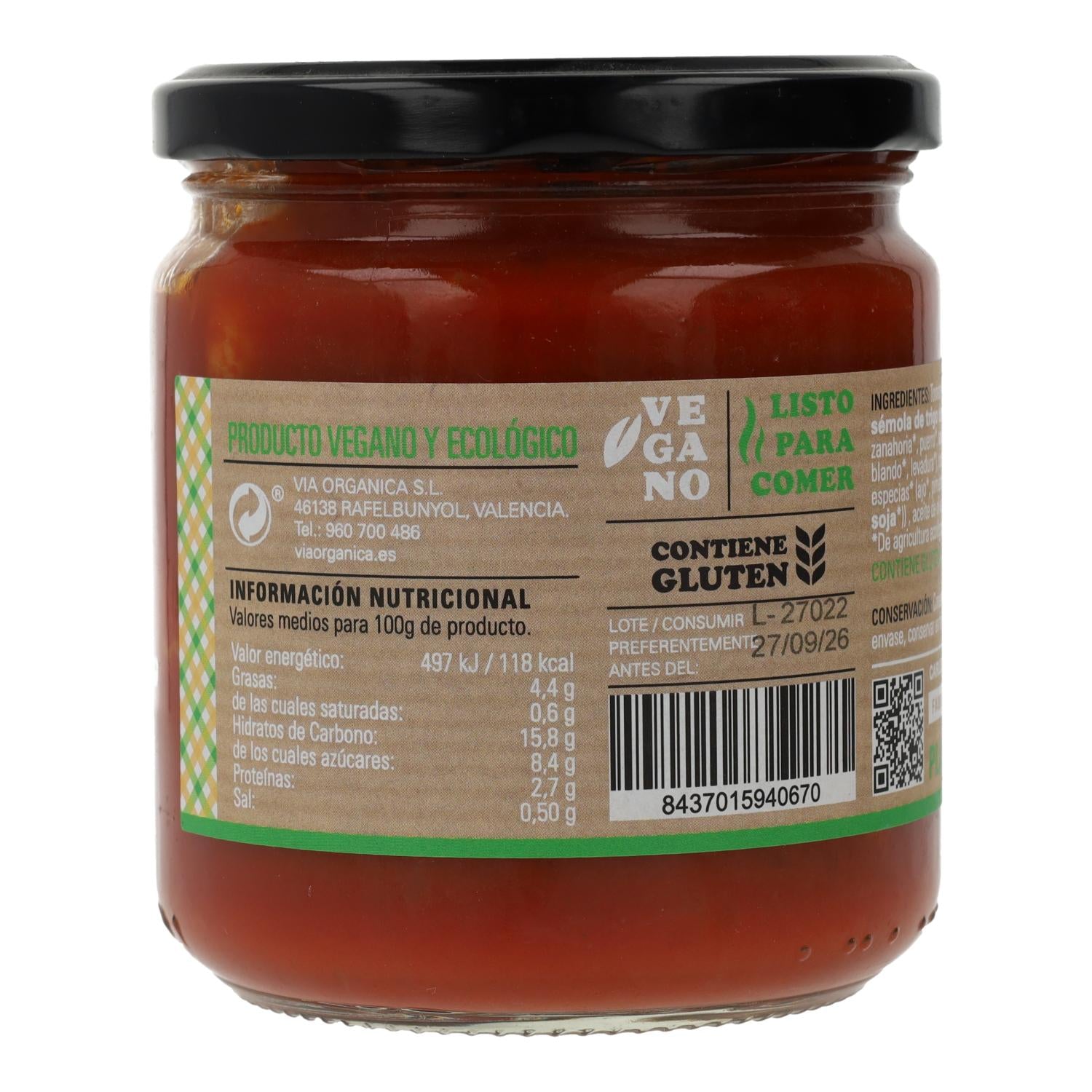 INGREDIENTES: Tomate 78%, tortellini 13.5% (masa de pasta de sémola de trigo duro, agua, relleno: verduras (cebolla, zanahoria, puerro, apio, espinacas), pan rallado (harina de trigo blando, levadura), copos de patata, aceite de girasol, sal marina, especias (ajo, pimienta, ajedrea), emulsinante: lecitina de soja, aceite de oliva virgen extra, azúcar de caña, cebolla, sal.