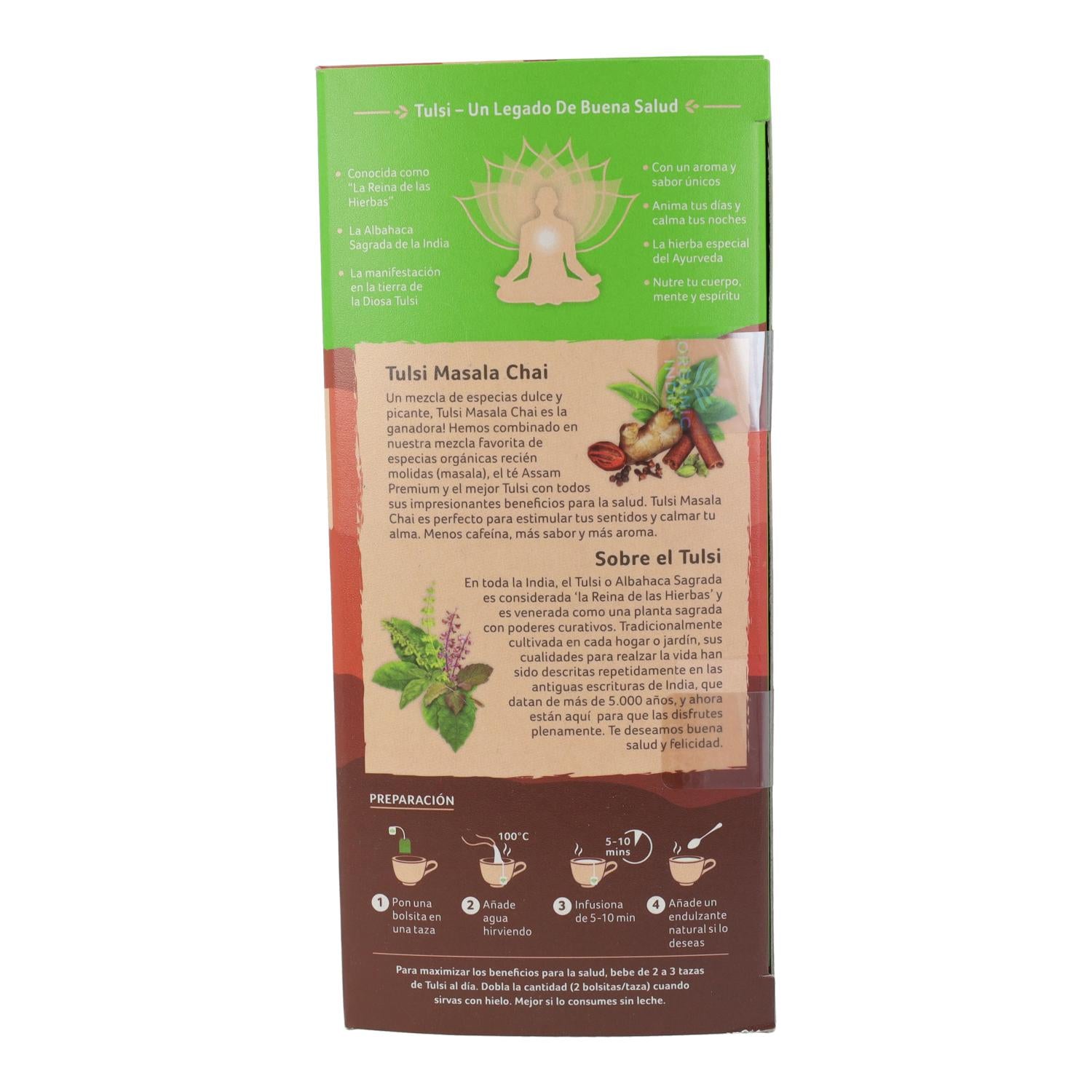 Ingredientes: En esta mezcla, las hojas y flores de Tulsi se combinan con Té negro Assam y especies orgánicas de la India como la canela, jengibre, cardamomo, pimienta negra, clavo, nuez moscada y macis. Contiene 16 mg de cafeína por bolsita.