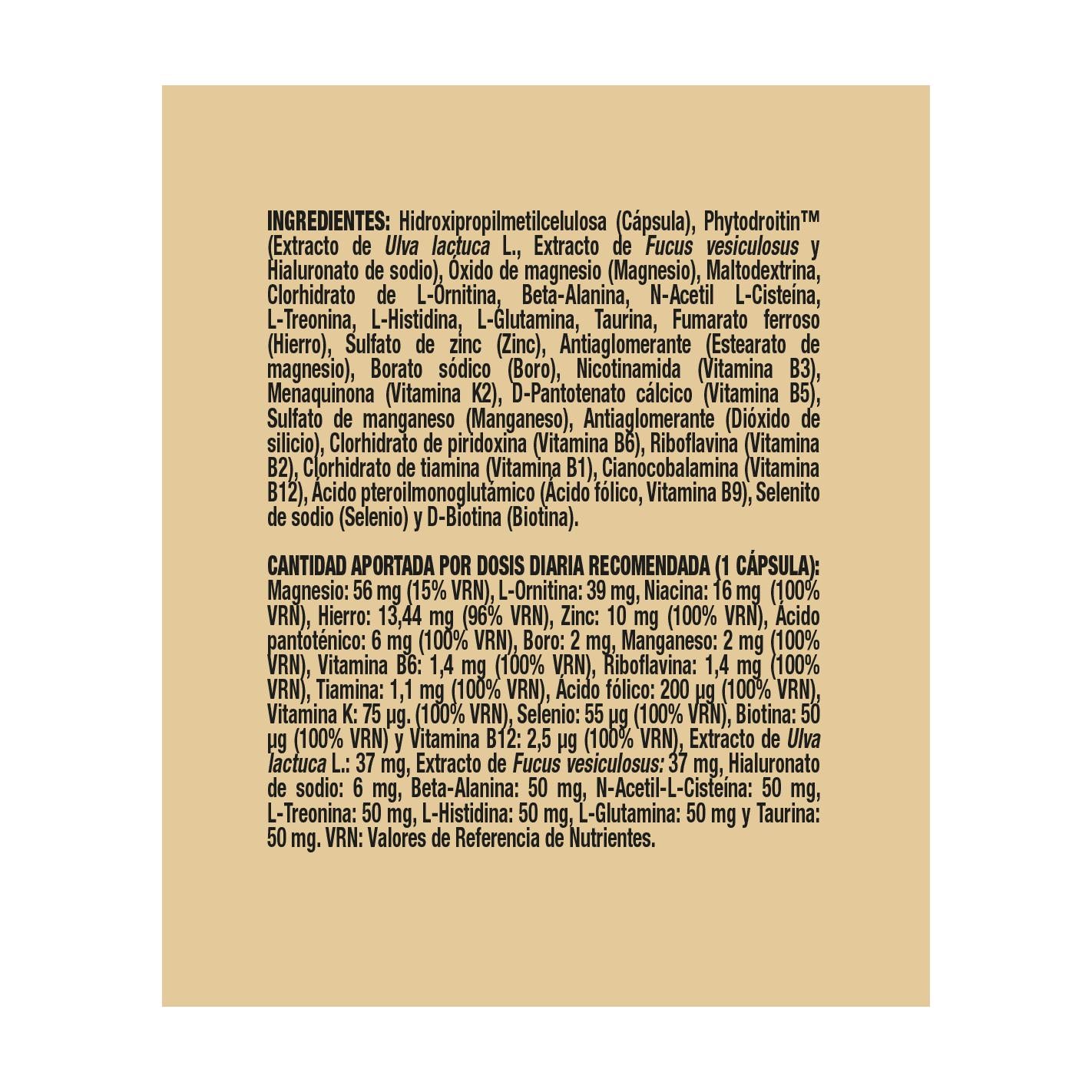 Magnesio, L-Ornitina, Niacina, Hierro, Zinc, Ácido pantoténico, Boro, Manganeso, Vitamina B6, Riboflavina, Tiamina, Ácido Fólico, Vitamina K, Selenio, Biotina, Vitamina B12, Ulva Lactuca, Fuscus vesiculosus, Ácido hialurónico, Beta-Alanina, N-acetilL-L-Cisteina, L-Treonina, L-Histidina, L-Glutamina y Taurina.