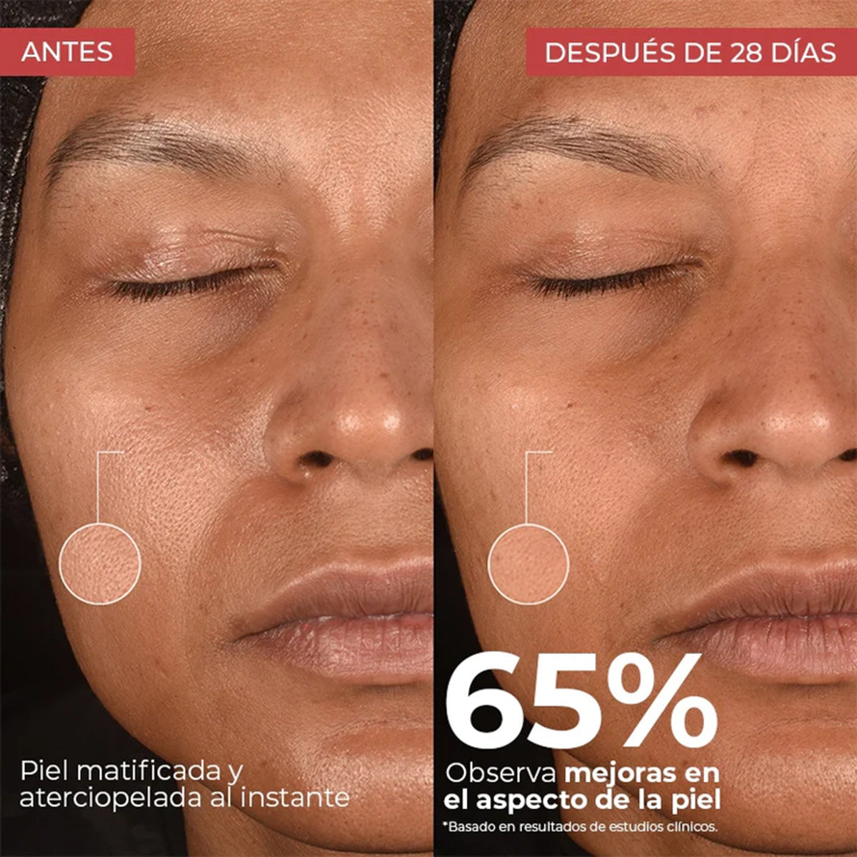 *Resultados obtenidos de un estudio independiente con panelistas donde 20 voluntarias usaron el sérum antiporos durante 28 días.