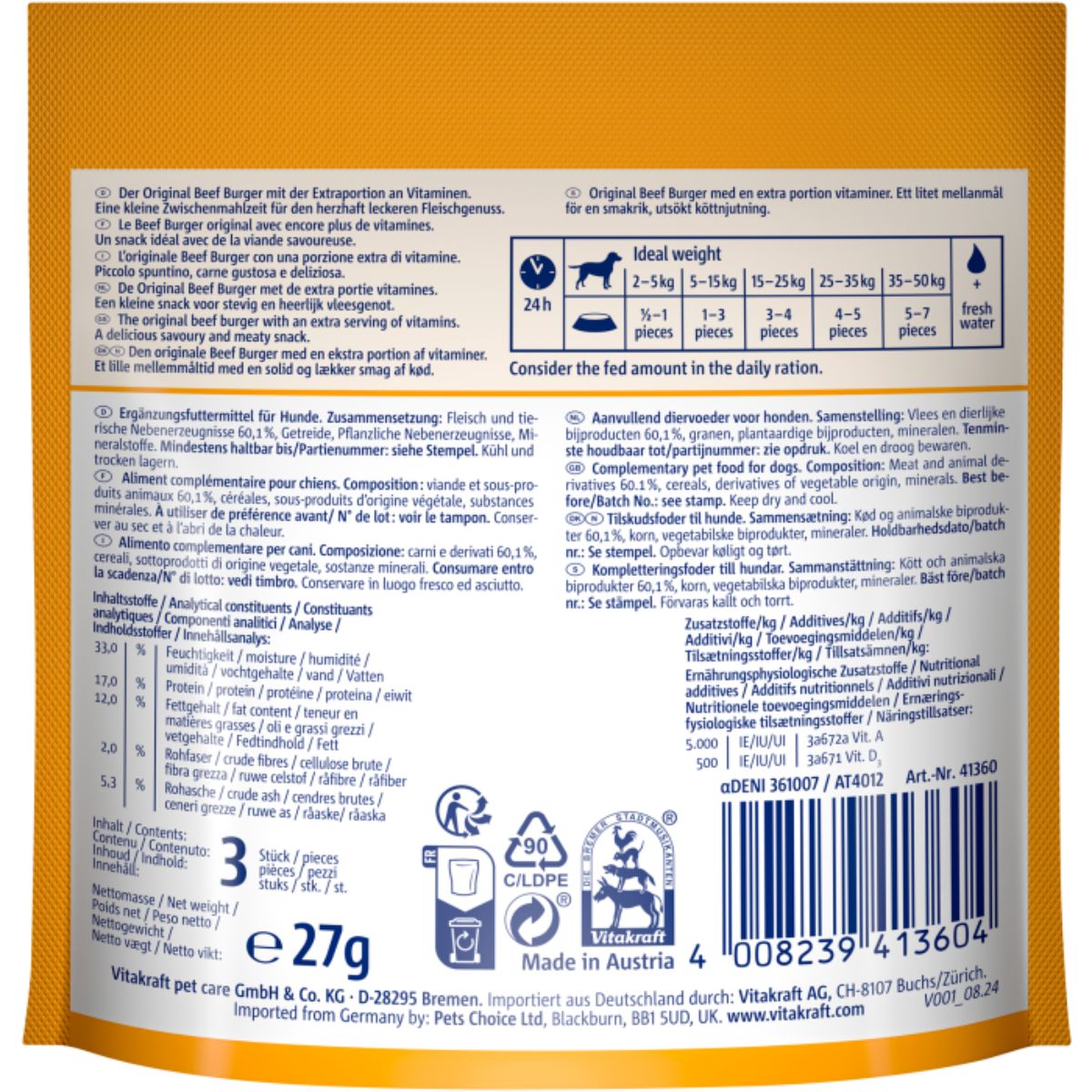 Tan sabroso y apetitoso como siempre: el burger original de Vitakraft®, ahora en un práctico pack de 3 unidades. Envasado al vacío para mantener todo su aroma, es perfecto para ofrecer una pequeña comida entre horas, incluso fuera de casa. Con su delicioso sabor a carne, conquistará a cualquier perro.
