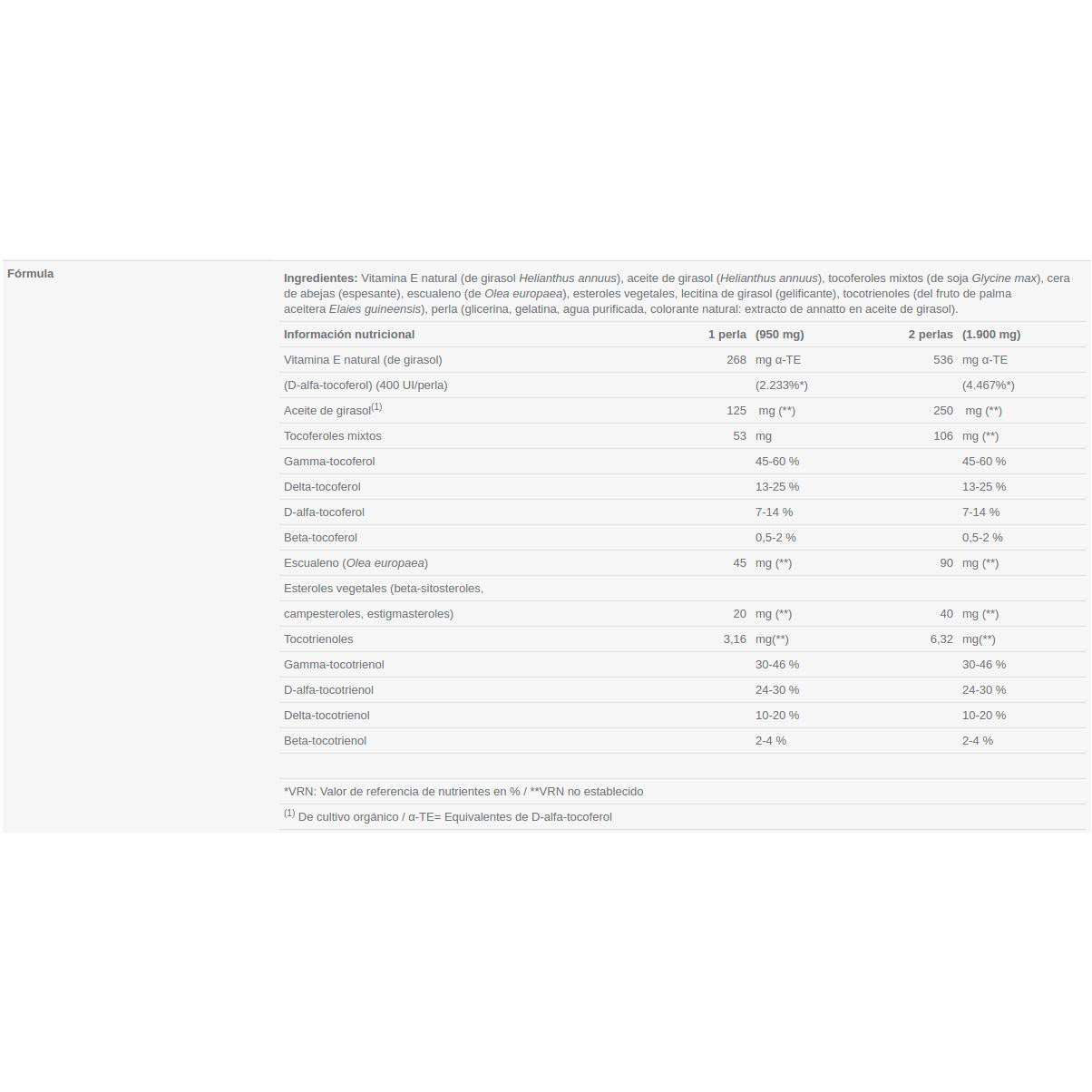 Vitamina E (D-alfa tocoferol), aceite portador (aceite vegetal), cápsula vegetal, antiaglomerantes.