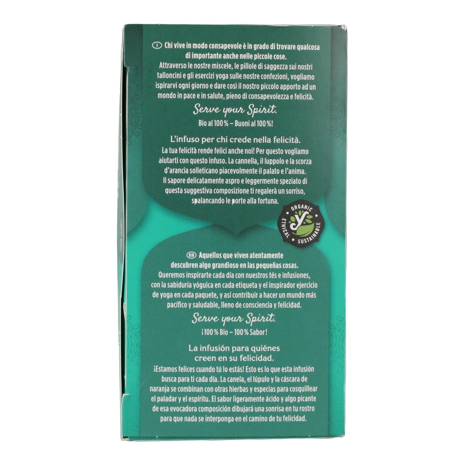 Con demasiada frecuencia perdemos el contacto con nuestra alma. YOGI TEA® Felicidad levanta el ánimo y nos recuerda la serenidad que hay en lo más profundo de nosotros. Con su combinación de la albahaca y los escaramujos con el hinojo, la canela y el fenogreco, esta infusión dulce sabe a un alegre día de verano, haciéndonos ver el sol que se esconde tras las nubes.