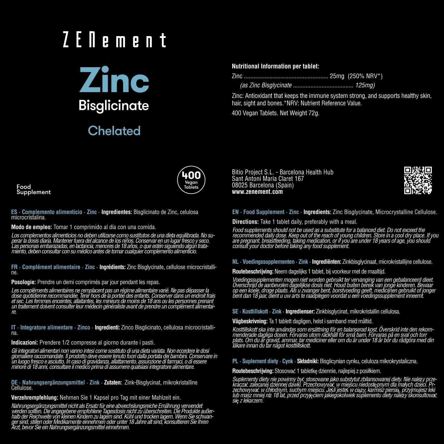 Zinc 25 mg (Bisglicinato) dosificación alta zenement 400 Comprimidos