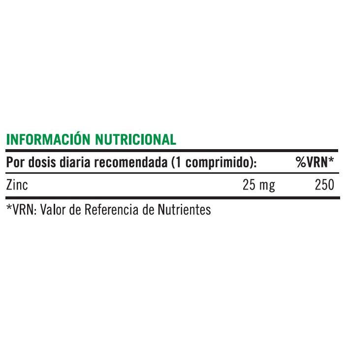 Alto contenido de una forma orgánica de zinc por comprimido: 25 mg. El zinc es un mineral que interviene en diferentes procesos en el organismo (síntesis de proteinas, metabolismo de los macronutrientes...) y contribuye al mantenimiento y correcta función de diferentes sistemas como la función cognitiva, la visión, la piel, y el sistema inmune o la protección celular antioxidante.