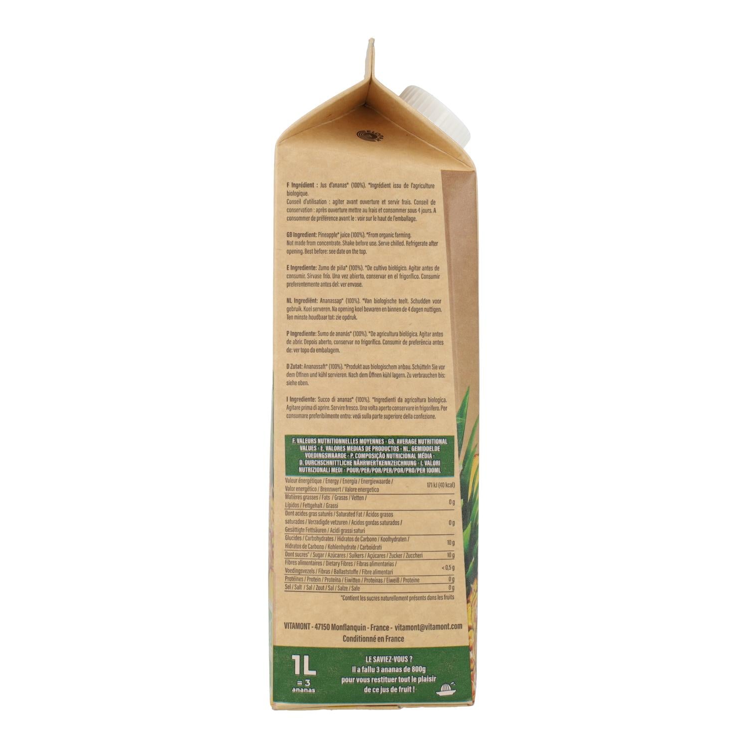 Zumo 100% natural de piña, elaborado con piñas de cultivo ecológico. Para obtener 1 litro de zumo se han exprimido 3 piñas frescas. Sin azúcares añadidos, mantiene el sabor auténtico y natural de la fruta. Producto certificado de alimentación ecológica.